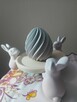 Dekoracyjna figurka przedstawiająca trzy zajączki trzymające stół, zaprojektowana z myślą o wydruku 3D. Zajączki ...