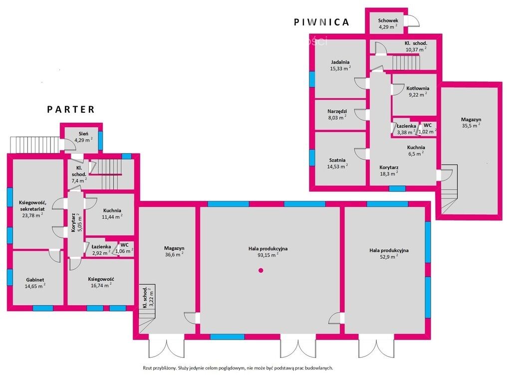 Budynek przyległy to magazyn (36,6 m²) i hala produkcyjna (93,15 m²