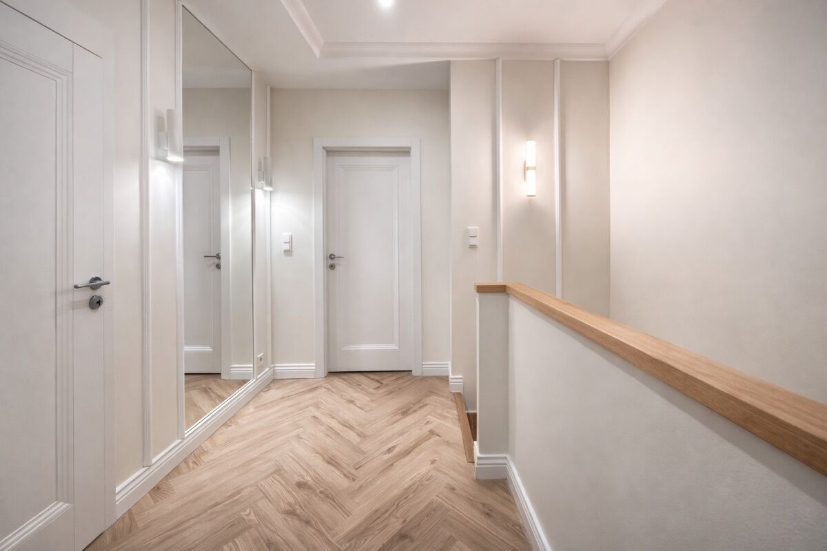 PIĘTRO: na piętrze znajdują się dwie sypialnie oraz imponujący master bedroom z prywatną garderobą/gabinetem. Dodatkowo znajduje się tu przestronna garderoba lub schowek oraz pralnia.