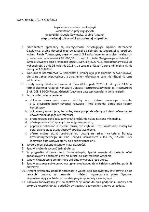 Syndyk masy upadłości ogłasza sprzedaż z wolnej ręki wierzytelności przysługujących upadłej Bernadecie Gawłowicz, osobie fizycznej nieprowadzącej działalności gospodarczej w upadłości w upadłości wobec Pawła Tomszczyna, ujęte w pozycji 5.1 spisu inwentarza (spisu należności), tj. należność w wysokości 98 000,00 zł z wyroku Sądu Okręgowego w Gdańsku I Wydział Cywilny z dnia 8 listopada 2016 r., sygn. akt I C 277/15, zaopatrzoną w klauzulę wykonalności z dnia 16 kwietnia 2018 r., za cenę nie niższą niż cenę minimalną, tj. nie niższą niż 1 960,00 zł.